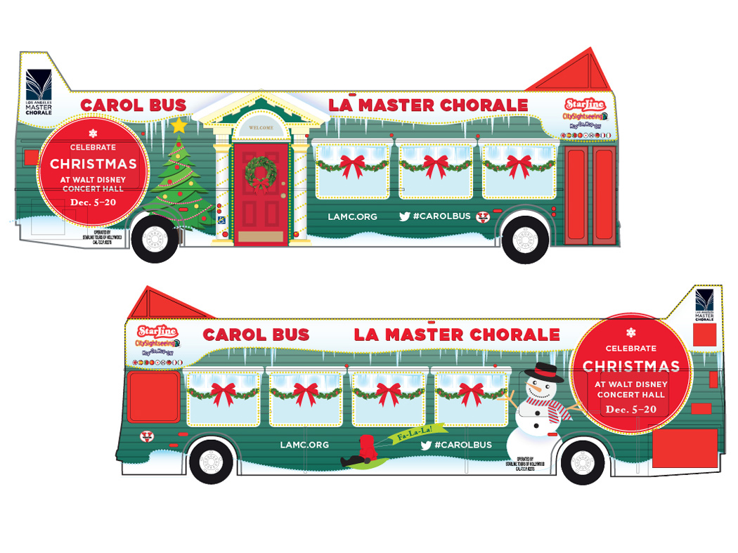 Promote the LAMC holiday concert series and launch the Carol Bus Sing-Along Tour concept. A Starline Tour bus by day and an LAMC Professional Caroling venue by night.